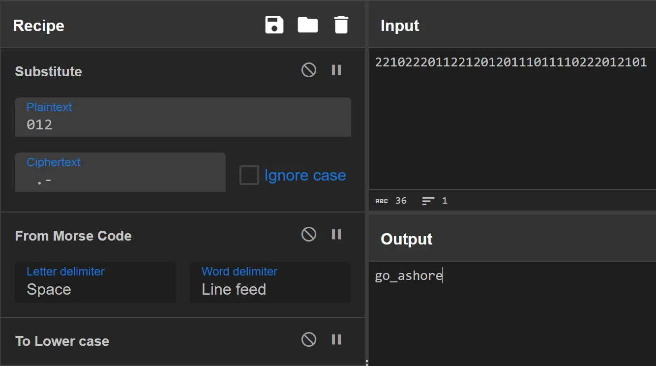 而这两个基本图形的交点数量全图数下来总共只有三种情况:0、1、2。这三种情况分别对应摩斯密码的三种状态,于是可以将图形转换为摩斯密码,然后解码就得到了 Flag: