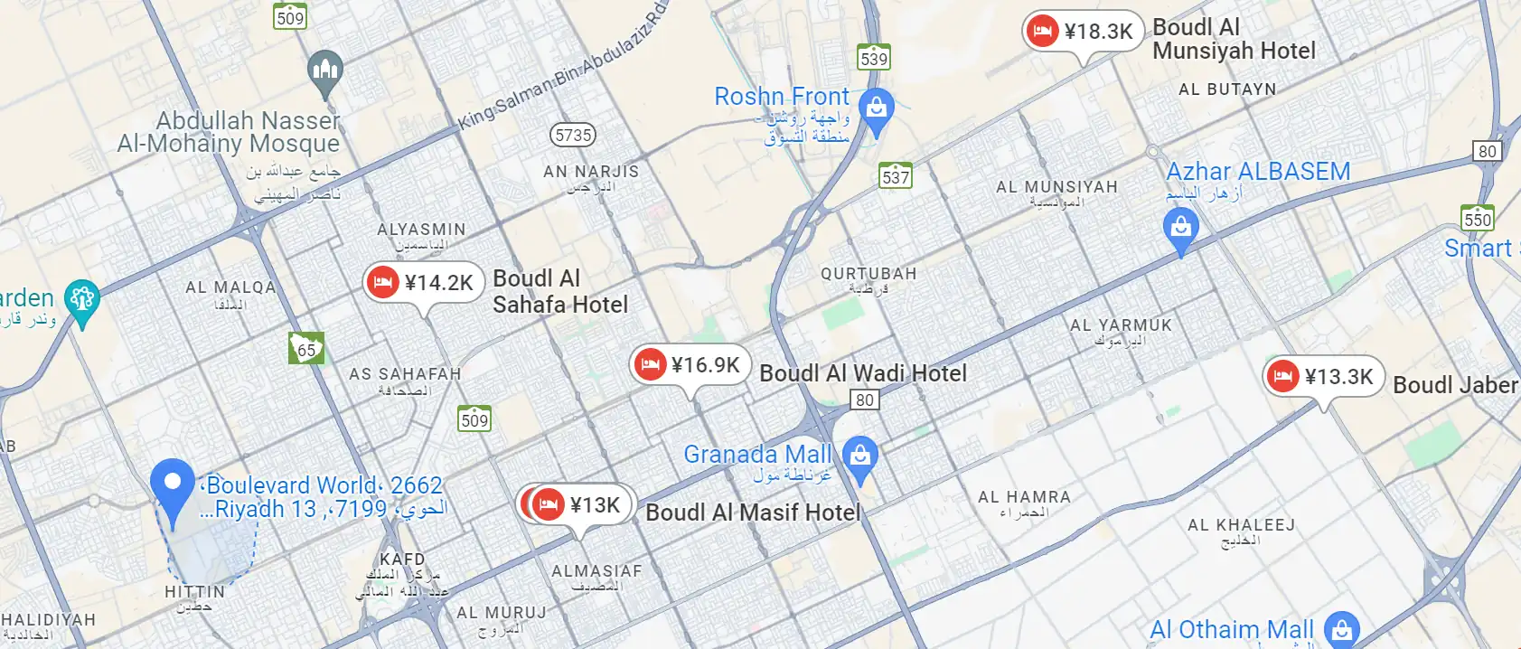 图中可以注意到的是「BOUDL Apart Hotel」以及「Starbucks」,并且题说酒店和咖啡馆很近。基于上一题的搜索结果,搜索「Boulevard World」附近的「BOUDL Apart Hotel」: