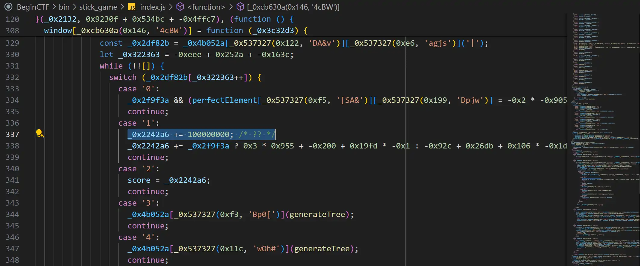 JavaScript 被混淆了,不过不要紧,稍微格式化后也能看。搜索 score 能找到分数变化部分的代码,手动给它加点分数,然后正常流程结束游戏就可以了(高亮的那一行是我自己补的):