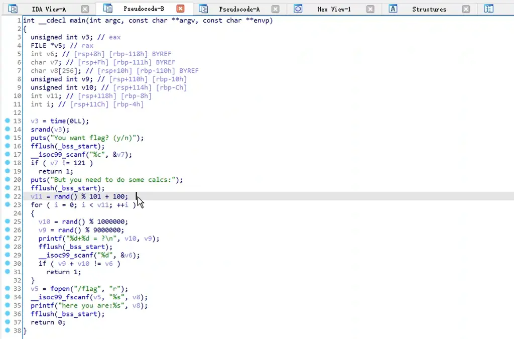 赛场上尝试过利用 Bash 特性 echo 'y' | /readflag 解决这个问题,然后发现后面还有交互式计算题。此时我直接将这个可执行文件下载了下来进行了反编译,发现其计算题次数不能固定,题目也是随机的,所以此处只能写脚本对其交互。最后我写的脚本如下: