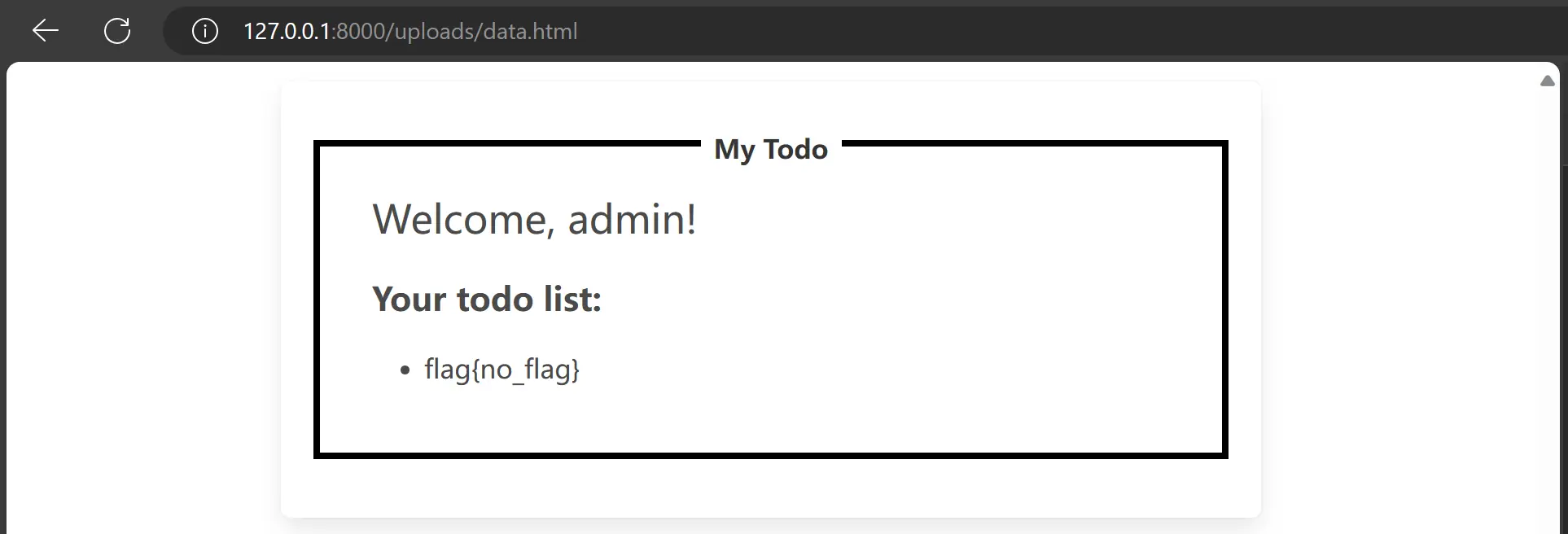 接下来随意注册一个账号,通过 /todo 页面的 Report 功能将 http://127.0.0.1/uploads/xss.html 提交给 admin,然后等待 admin 访问即可。等待片刻,在 /uploads/data.html 中可以看到 admin 的 Todo List,其中包含了 Flag(此处为本地测试环境):