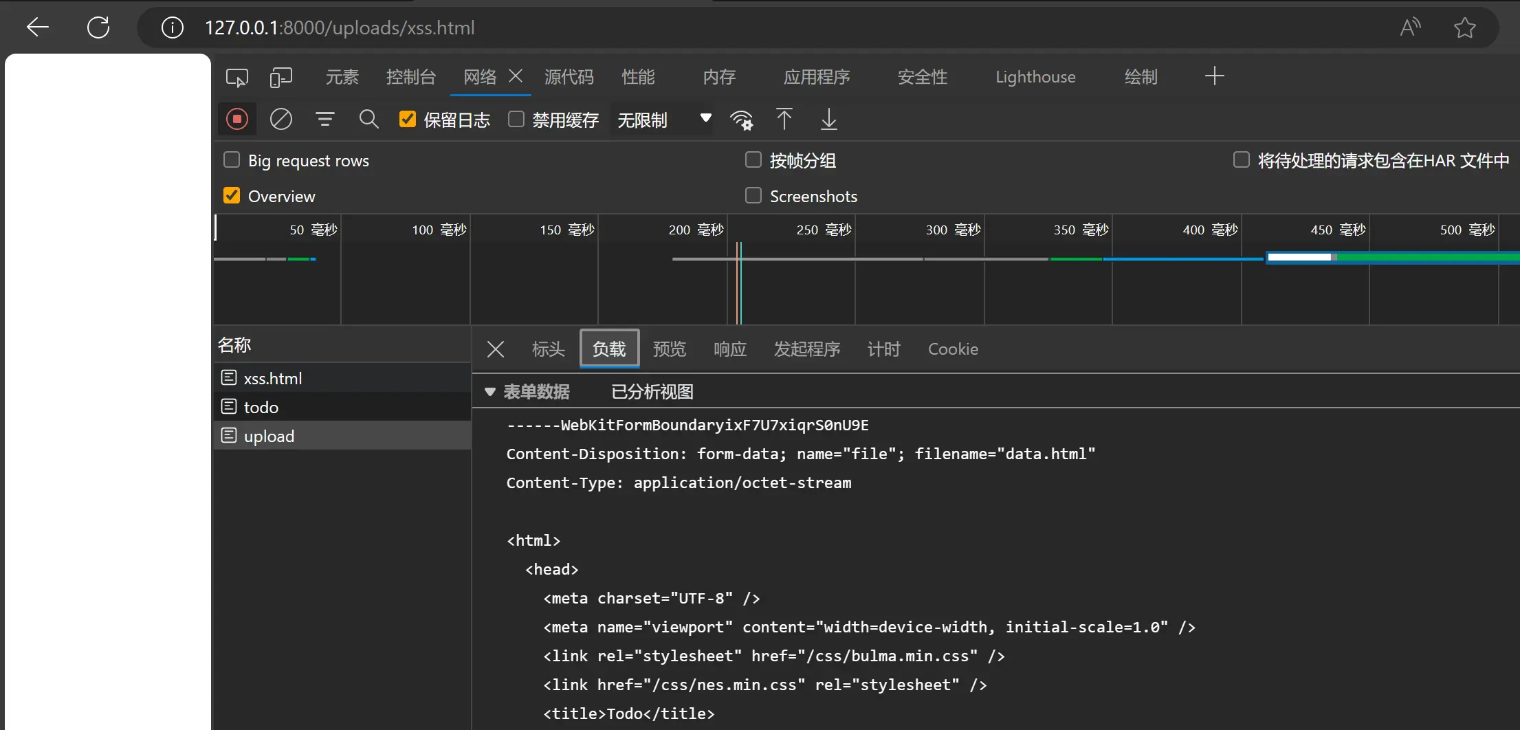 其大致原理是,先通过 /todo 接口获取 admin 的 Todo List,然后将其作为文件上传到服务器上。这样,我们就可以通过 /uploads/data.html 访问到这个文件,从而获取到 admin 的 Todo List,也就能得到 Flag 了。先将这个页面上传到服务器上,可以自己手搓一个上传页面: